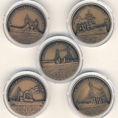 Турецкие корабли Первой мировой войны.Набор из 5 монет номиналом 2 1/2 лиры. Сертификаты на каждую монету. 23,33 г, 38,61 мм, тираж 3000 шт.