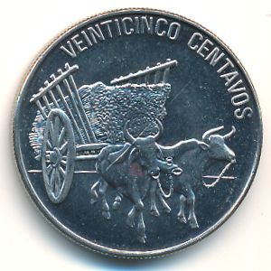 KM#71.1 Dominican Republic, 25 centavos Nickel Clad Steel, 24.2 mm., 5.7 g. Категории:. Subject: Native Culture. Obv: National arms, date below. Rev: Two oxen pulling cart, denomination above. Информация о выпуске (подробности в каталоге):