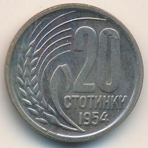 KM#55 Bulgaria, 20 stotinki Copper-Nickel, 19.49 mm., 2.8 g. Категории:. Obv: National arms within circle. Rev: Denomination above date at right, grain sprig at left. Edge: Reeded. Информация о выпуске (подробности в каталоге):