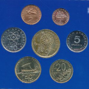 Набор из 7 монет номиналами 1 драхма, 2 драхмы, 5 драхм, 10 драхм, 20 драхм, 50 драхм, 100 драхм. Упаковка: картонка в пластиковом боксе.