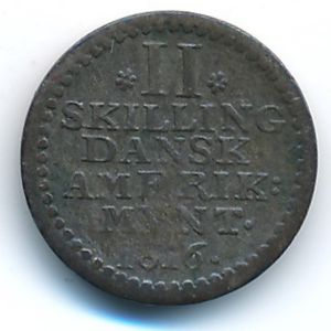 KM#13 Danish West Indies, 2 skilling (1816 г.) 0.2500 Silver, 1.218 g. Категории:. Ruler: Frederik VI. Obv: Crowned arms. Rev: Value and date. Edge: Reeded. Смотрите подробное описание типа в каталоге.