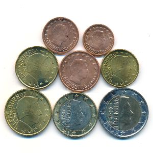 Набор из 8 монет Люксембурга 2010 года номиналами 1 евроцент, 2 евроцента, 5 евроцентов, 10 евроцентов, 20 евроцентов, 50 евроцентов, 1 евро (биметалл), 2 евро (биметалл).