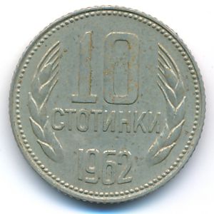 KM#62 Bulgaria, 10 stotinki Nickel-Brass, 16.11 mm., 1.59 g. Категории:. Obv: National arms within circle, date 9 • IX • 1944 on ribbon. Rev: Denomination above date within wreath. Edge: Reeded. Информация о выпуске (подробности в каталоге):