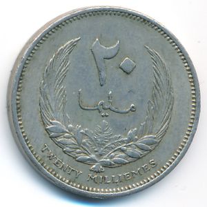 KM#9 Libya, 20 milliemes Copper-Nickel, 24.1 mm., 6.05 g. Категории:. Ruler: Idris I. Obv: Crowned national arms above dates. Rev: Value within wreath. Информация о выпуске (подробности в каталоге):