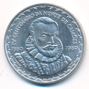 KM#611 Portugal, 1000 escudos (1980 г.) 0.9250 Silver, 17 g. Категории:. Subject: 400th Anniversary - Death of Louis de Camoes. Obv: Shield within globe above sprig. Rev: Armored bust 1/4 right flanked by dates. Смотрите подробное описание типа в каталоге.