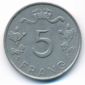 KM#50 Luxemburg, 5 francs (1949 г.) Copper-Nickel, 25.5 mm., 7.1 g. Категории:. Ruler: Charlotte. Obv: Head left. Rev: Value flanked by flowers below crown and ribbon. Смотрите подробное описание типа в каталоге. Уточните информацию о наличии этого товара по телефону +7 495 925-96-98.