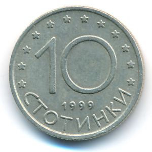 KM#240 Bulgaria, 10 stotinki (1999 г.) Copper-Nickel, 18.5 mm. Категории:. Obv: Madara horseman right, animal below. Rev: Denomination above date. Edge: Reeded. Смотрите подробное описание типа в каталоге.