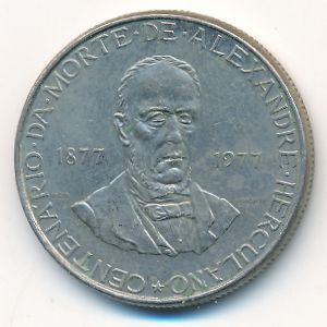 KM#608 Portugal, 25 escudos (1977 г.) Copper-Nickel, 26.5 mm. Категории:. Subject: 100th Anniversary - Death of Alexandre Herculano, Poet. Obv: Shield. Rev: Bust flanked by dates facing 1/4 right. Смотрите подробное описание типа в каталоге.