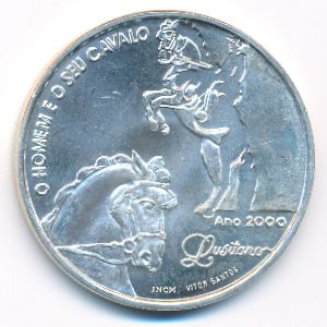 KM#727 Portugal, 1000 escudos (2000 г.) 0.5000 Silver, 40 mm., 27 g. Категории:. Series: Ibero-America. Obv: Shield within center of assorted shields. Rev: Lusitano horses and rider. Edge: Reeded. Смотрите подробное описание типа в каталоге.