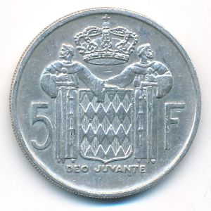KM#141 Monaco, 5 francs (1960 г.) 0.8350 Silver, 12 g. Категории:. Ruler: Rainier III. Obv: Head left. Rev: Crowned arms with supporters flanked by value. Смотрите подробное описание типа в каталоге.