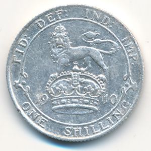 KM#800 Great Britain, 1 shilling (1910 г.) 0.9250 Silver, 23.5 mm., 5.6552 g. Категории:. Ruler: Edward VII. Obv: Head right. Rev: Lion atop crown dividing date. Смотрите подробное описание типа в каталоге. Уточните информацию о наличии этого товара по телефону +7 495 925-96-98.