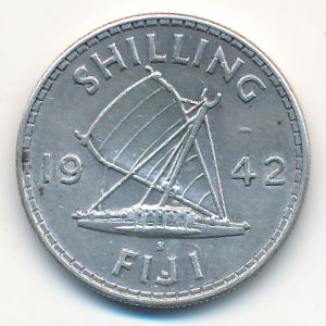 KM#12a Fiji, 1 shilling 0.9000 Silver, 23.5 mm., 5.6552 g. Категории:. Ruler: George VI. Obv: Crowned head left. Rev: Outrigger divides date, denomination above. Информация о выпуске (подробности в каталоге):