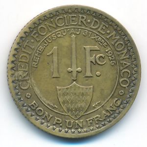 KM#111 Monaco, 1 franc (1924 г.) Aluminum-Bronze Категории:. Ruler: Louis II. Obv: Hercules shooting bow to right. Rev: Shield below value within circle. Смотрите подробное описание типа в каталоге. Уточните информацию о наличии этого товара по телефону +7 495 925-96-98.