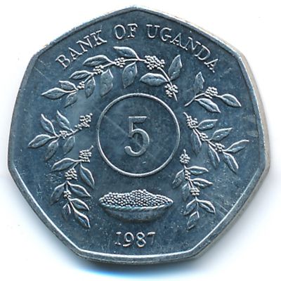 KM#29 Уганда, 5 шиллингов Никелированная сталь, 20.23 мм, 3.5 г Категории: Необычная форма, Растения. Информация о выпуске (подробности в каталоге):