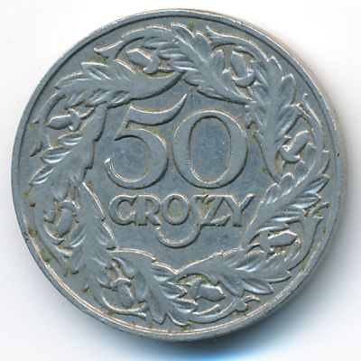 Y#13 Польша, 50 грошей Никель, 23 мм, 5 г Категории: Без тематики. Аверс: в центре - герб Польши - коронованный орел. Над орлрм дата - 1923. По кругу надпись: RZECZPOSPOLITA POLSKA. Надпись и дата разделены ромбами. Реверс: в центре в венке из дубовых листьев номинал в две строки - 50 GROSZY. Информация о выпуске (подробности в каталоге):