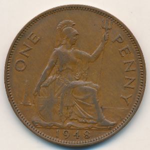 KM#845 Великобритания, 1 пенни Бронза, 30.8 мм, 9.45 г Категории: Без тематики. Георг VI. Информация о выпуске (подробности в каталоге):