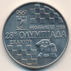 KM#152 Греция, 100 драхм Медь-Никель, 31 мм Категории: Животные, Птицы, Спорт, Олимпийские игры, Юбилейные. 28 шахматная олимпиада проходила с 12 по 30 ноября 1988 года в Греции. Сова. Информация о выпуске (подробности в каталоге):