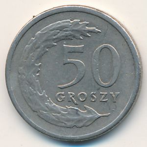 Y#281 Польша, 50 грошей Медь-Никель, 20.5 мм, 3.94 г Категории: Без тематики. Аверс: в центре – герб страны: коронованный польский орел, под правой лапой орла – знак монетного двора Варшавы (M/W), под орлом – год выпуска, обрамленный двумя точками. Круговая надпись: RZECZPOSPOLITA POLSKA. Реверс: слева – полукруглый венок из листьев, справа – номинал в две строки: 50 GROSZY. Гурт: рифленый. Информация о выпуске (подробности в каталоге):