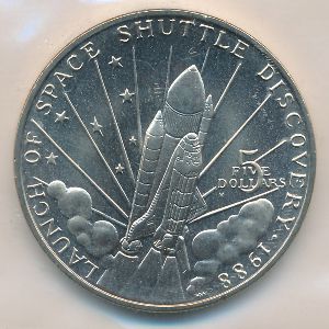 KM#6 Маршалловы острова, 5 долларов Медь-Никель, 38.8 мм, 29.5 г Категории: Космос, Транспорт, Юбилейные. Запуск космического шаттла Дискавери. Информация о выпуске (подробности в каталоге):