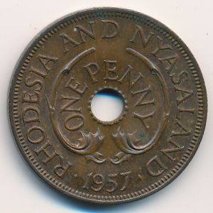KM#2 Родезия и Ньясаленд, 1 пенни Бронза, 6.3 г Категории: Животные, Необычная форма. Слоны. Елизавета II. Информация о выпуске (подробности в каталоге):