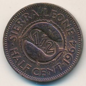 KM#16 Сьерра-Леоне, 1/2 цента Бронза, 20.2 мм, 2.85 г Категории: Животные, Рыбы. Рыбы. Информация о выпуске (подробности в каталоге):