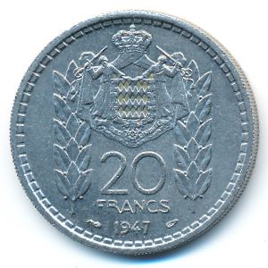 KM#124 Монако, 20 франков Медь-Никель Категории: Без тематики. Аверс: Луи II (12.07.1870 - 9.05.1949) - 11-й князь Монако. Информация о выпуске (подробности в каталоге):