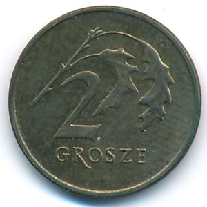 Y#277 Польша, 2 гроша Латунь, 17.5 мм, 2.13 г Категории: Без тематики. Аверс: в центре – герб страны: коронованный польский орел, под правой лапой орла – знак монетного двора Варшавы (M/W), под орлом – год выпуска. Круговая надпись: RZECZPOSPOLITA POLSKA. Надпись и дата разделены точками. Реверс: в центре – номинал в две строки: 2 GROSZE, вверху – веточка с двумя листьями. Гурт гладкий. Информация о выпуске (подробности в каталоге):