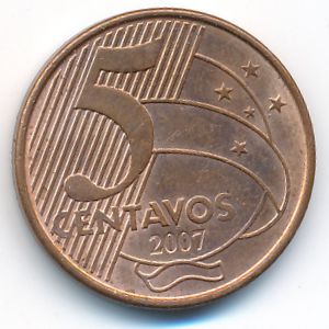 KM#648 Бразилия, 5 сентаво Медь-Сталь, 22 мм, 4.1 г Категории: Без тематики. Аверс: Портрет Жоакина Жозе да Силва Шавьера (Тирадентеса) (1748 - 1792), руководителя бразильского движения за независимость в 80-х годах XIX века. Информация о выпуске (подробности в каталоге):