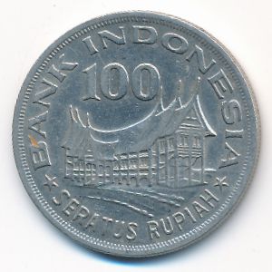 KM#42 Индонезия, 100 рупий Медь-Никель, 28.5 мм, 7 г Категории: Без тематики. Лесное хозяйство для процветания страны. Аверс: Жилище минангкабу. Реверс: легендарное Древо Жизни. Информация о выпуске (подробности в каталоге):