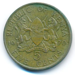 KM#10 Кения, 5 центов Никель-Латунь, 25.5 мм, 5.6 г Категории: Без тематики. Реверс: Джомо Кениата (20 октября 1891 - 22 августа 1978), первый премьер-министр в 1963-1964 и президент Кении в 1964-1978. Информация о выпуске (подробности в каталоге):