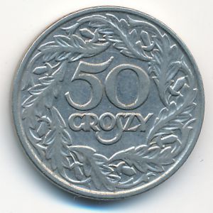 Y#13 Польша, 50 грошей (1923 г.) Никель, 23 мм, 5 г Категории: Без тематики. Аверс: в центре - герб Польши - коронованный орел. Над орлрм дата - 1923. По кругу надпись: RZECZPOSPOLITA POLSKA. Надпись и дата разделены ромбами. Реверс: в центре в венке из дубовых листьев номинал в две строки - 50 GROSZY. Смотрите подробное описание типа в каталоге.