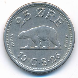 KM#5 Гренландия, 25 эре (1926 г.) Медь-Никель Категории: Без тематики. Полярный медведь. Смотрите подробное описание типа в каталоге. Уточните информацию о наличии этого товара по телефону +7 495 925-96-98.