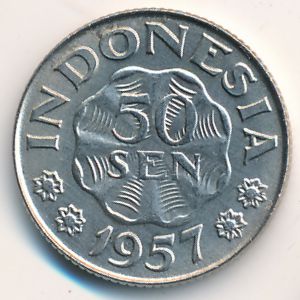 KM#10.2 Индонезия, 50 сен (1957 г.) Медь-Никель, 29 мм, 3 г Категории: Выдающиеся личности, Юбилейные. Портрет принца Дипонегоро. Без надписи справа от портрета. Другой портрет, более крупный шрифт, чем на монете KM#10.1 Смотрите подробное описание типа в каталоге.
