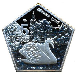 Верхняя Лужица., 25 марок Латунь, покрытая серебром, 37 мм, 22.3 г Категории: Без тегов. UNUSUAL. Замок Мускау. Лебедь. Птица. Информация о выпуске (подробности в каталоге):