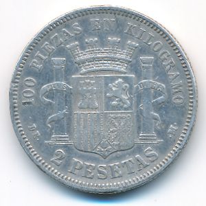 KM#654 Испания, 2 песеты (1870 г.) 0.8350 Серебро, 10 г Категории: Без тематики. Смотрите подробное описание типа в каталоге.