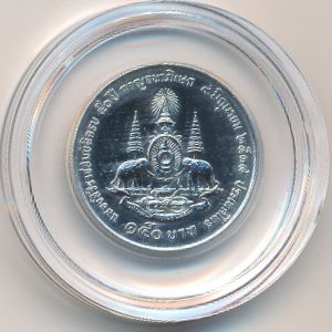 Y#322 Таиланд, 150 бат 0.9250 Серебро, 27 мм, 7.5 г Категории: Архитектура, Выдающиеся личности, Животные, Юбилейные. 50-летие правления короля Рамы IX. Информация о выпуске (подробности в каталоге):