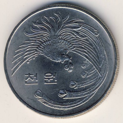 KM#25 South Korea, 1000 won Nickel, 33 mm., 17 g. Категории:. Subject: 1st Anniversary of the 5th Republic. Obv: Yin-yang symbol within rectangle above value flanked by flames. Rev: Imaginary bird called Bong-hwang who represents a King. Информация о выпуске (подробности в каталоге):