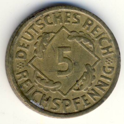 Weimar Republic, 5 reichspfennig, 1936 Посмотреть подробную информацию о Weimar Republic, 5 reichspfennig, 1936 Посмотреть очень большое изображение Weimar Republic, 5 reichspfennig, 1936 Посмотреть другие изображения