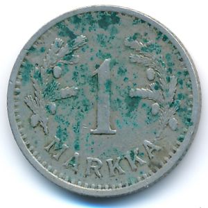 KM#30 Finland, 1 markka Copper-Nickel, 21 mm., 4 g. Категории:. Obv: Rampant lion left divides date. Rev: Denomination flanked by branches. Note: Reduced size. Информация о выпуске (подробности в каталоге):