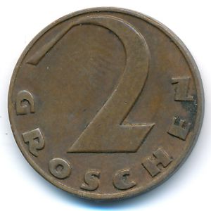 KM#2837 Austria, 2 groschen Bronze, 19 mm., 3.3 g. Категории:. Edge Type: Plain. Description Obverse: Thick cross, date below. Description Reverse: Large value. Информация о выпуске (подробности в каталоге):