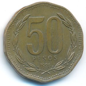 KM#219.2 Chile, 50 pesos Aluminum-Bronze, 25.4 mm., 7 g. Категории:. Obv: Bust of Gen. Bernardo O'Higgins right. Obv. Leg.: REPUBLICA - DE CHILE. Rev: Denomination above date within sprays. Edge: Plain. Информация о выпуске (подробности в каталоге):
