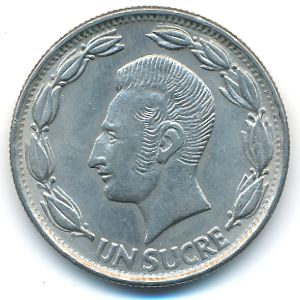 KM#78b Ecuador, 1 sucre Nickel Clad Steel, 26 mm., 5.75 g. Категории:. Obv: Flag draped arms, date below. Rev: Head left within wreath, denomination below. Note: Ship in arms similar to KM#78. Информация о выпуске (подробности в каталоге):