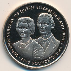 Ruler: Elizabeth II. Subject: 50th Anniversary - Queen Elizabeth and Prince Philip. Obv: Crowned head right. Obv. Designer: Raphael Maklouf. Rev: Current portrait of Queen Elizabeth and Prince Philip. Edge: Reeded, smooth alternating edge.