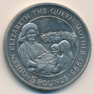 KM#14 Alderney, 5 pounds (1995 г.) Copper-Nickel, 38.5 mm., 28.28 g. Категории:. Ruler: Elizabeth II. Subject: Queen Mother - Children. Rev: Queen Mother with children within circle. Смотрите подробное описание типа в каталоге.