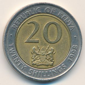 KM#32 Kenya, 20 shillings Bi-metallic, 25.5 mm., 9 g. Категории:. Obv: Value above national arms. Rev: Bust of President Daniel Toroitich Arap Moi right. Информация о выпуске (подробности в каталоге):