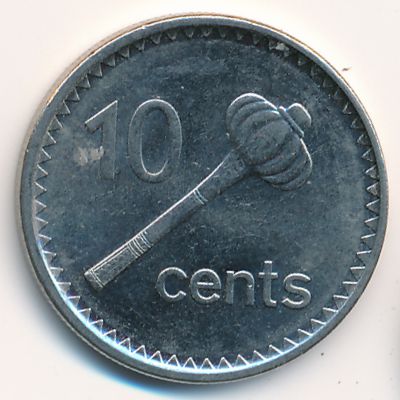 KM#120 Fiji, 10 cents Nickel Plated Steel, 21.5 mm., 3.55 g. Категории:. Ruler: Elizabeth II. Obv: Crowned head right. Rev: Throwing club - ula tava tava divides value. Edge: Reeded. Информация о выпуске (подробности в каталоге):