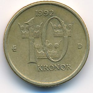 KM#877 Sweden, 10 kronor Copper-Aluminum-Zinc, 20.46 mm., 6.67 g. Категории:. Ruler: Carl XVI Gustaf. Obv: Head left. Rev: Three crowns within value. Информация о выпуске (подробности в каталоге):