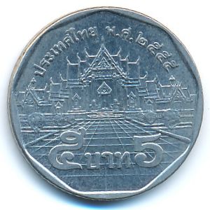 Y#446 Thailand, 5 baht Copper-Nickel Clad Copper, 24 mm., 6 g. Категории:. Edge Type: Coarse Reeding. Description Obverse: King's portrait. Description Reverse: Benchamabophit Temp, Bangkok, Temple top does not break legend. Информация о выпуске (подробности в каталоге):