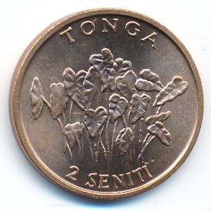 KM#67 Tonga, 2 seniti Bronze, 19.46 mm., 3.87 g. Категории:. Ruler: King Taufa'ahau Tupou IV. Series: World Food Day. Obv: Taro Plants. Rev: Paper doll cutouts form design in center circle of wreath. Edge: Plain. Информация о выпуске (подробности в каталоге):
