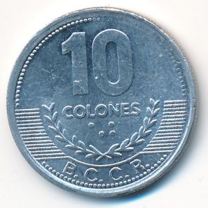KM#228b Costa Rica, 10 colines Aluminum, 22.97 mm., 1.13 g. Категории:. Obv: National arms. Obv. Legend: REPUBLICA DE COSTA RICA. Rev: Denomination above sprays, B.C.C.R. Edge: Plain. Информация о выпуске (подробности в каталоге):